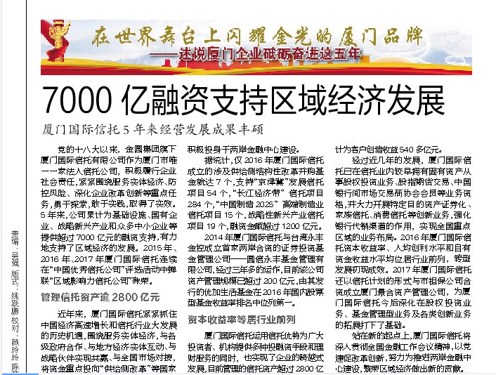 近年来,厦门国际信托紧紧抓住中国经济高速增长和信托行业大发展的历史机遇,围绕服务实体经济,与各级政府合作、与地方经济实体互动、与战略伙伴实现共赢、与全国市场对接,将资金重点投向“供给侧改革”等国家重大战略、战略性新兴产业等领域,并积极投身于两岸金融中心建设。
