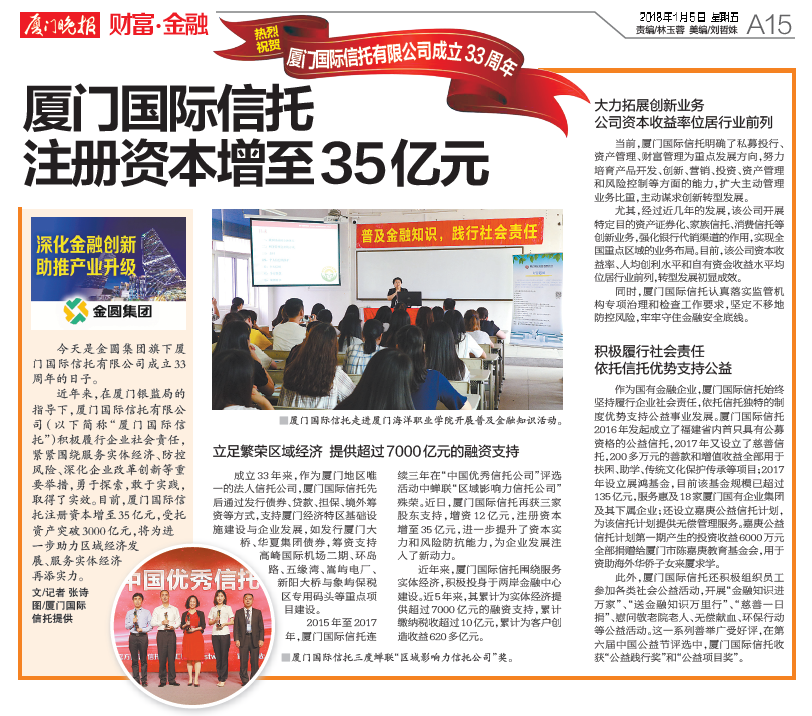 近年来,在厦门银监局的指导下,厦门国际信托有限公司(以下简称“厦门国际信托”)积极履行企业社会责任,紧紧围绕服务实体经济、防控风险、深化企业改革创新等重要举措,勇于探索,敢于实践,取得了实效。目前,厦门国际信托注册资本增至35亿元,受托资产突破3000亿元,将为进一步助力区域经济发展、服务实体经济再添实力。