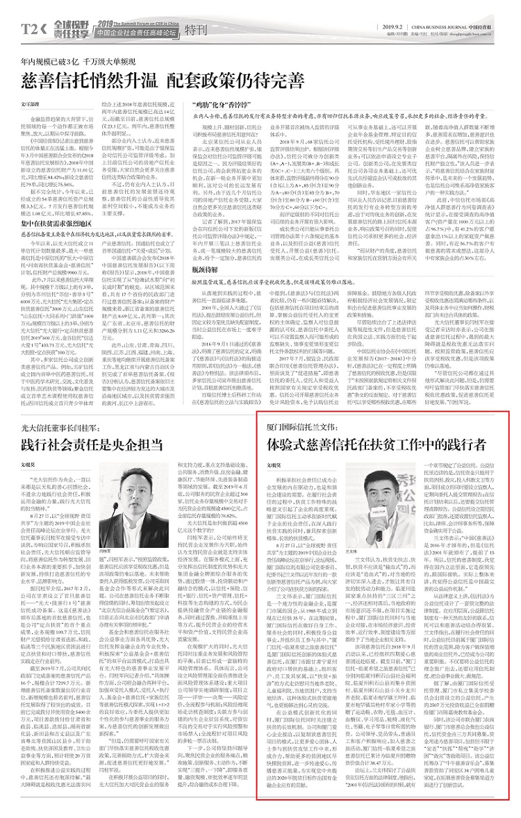 8月27日,以"全球视野 责任共享"为主题的2019中国企业社会责任高峰论坛在京举行,论坛现场,厦门国际信托有限公司党委委员、纪委书记兰文伟以近年发行的一款创新型慈善信托产品为例,向大家介绍了公司在扶贫方面的探索。