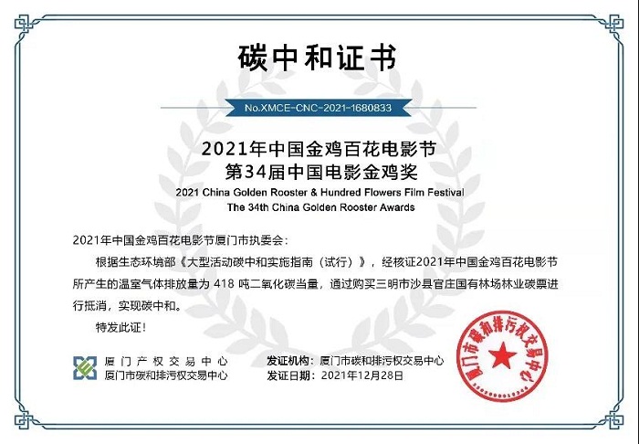 市生态环境局相关负责人介绍说“我们通过厦门产权交易中心(厦门市碳和排污权交易中心)的专业化服务,运用购买林业碳票方式进行抵消,并由厦门产权交易中心出具碳中和证书,实现了电影节历史上的首次‘零碳排放’。”