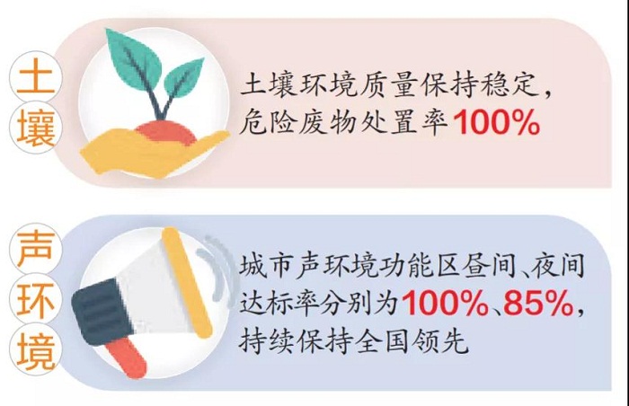 2021年,厦门市生态环境质量持续保持全国前列。1月-11月空气质量综合指数2.56,在全国排名第6,优良率99.7%。饮用水水源地,主要流域国、省控断面,小流域省考断面实现“四个100%达标”,隘头潭国控点水质在福建省唯一连续6个月进入全国前30名红榜。近岸海域水质持续提升,全年优良水质面积比90%、点位比81.8%,分别提高7.6个和15.1个百分点。土壤环境质量保持稳定,危险废物处置率100%。城市声环境功能区昼间、夜间达标率分别为100%、85%,持续保持全国领先,厦门市公众对生态环境质量满意度再次荣膺全省第一。