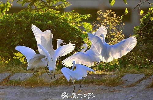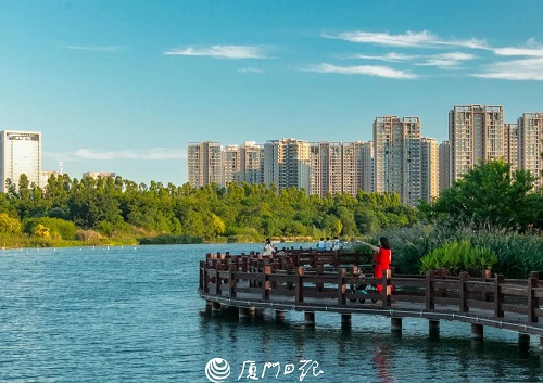 在厦门环东海域东北角、同安湾湾顶处,有一片郁郁葱葱的海上森林,远远望去,就像是一道拱卫海岸线的绿色屏障。成群结队的白鹭或从低空掠过,或停在林中嬉戏、觅食。蜿蜒曲折的木栈道掩映在成片绿色里,向大海延伸而去,游人踏足其中,仿佛在海上漫步。这里是福建省最大的人工红树林公园——下潭尾滨海湿地公园,也是2017年金砖国家领导人厦门会晤碳中和项目所在地。