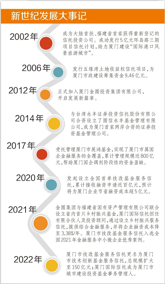 厦门国际信托深度参与厦门市国际化、现代化产业引进和就业创造,发挥在全国展业的优势,善用金融工具先行先试,服务政府,连接企业,赋能重大项目,支持岛内外产业建设和生态发展。