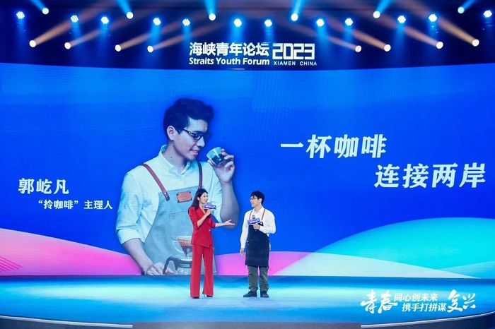 “之所以取名‘拎咖啡’,我想表达三层含义,”郭屹凡说:“在闽南语中,‘拎’与‘喝’的读音相近;拎,含有拎着走的意思,更方便于现代消费者的取用方式;‘拎’亦与‘link’谐音,希望咖啡成为连结彼此、连结文化等等的载体。”在第二十一届海峡青年论坛现场,拎咖啡的主理人郭屹凡精心准备了最近正在研发的咖啡与茶有机结合的新品,请现场的两岸青年品尝。