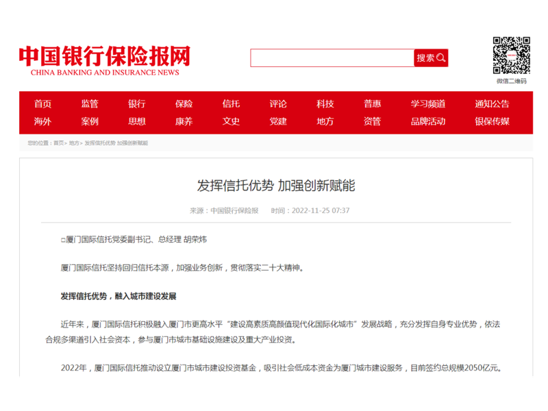 11月25日 《中国银行保险报》刊发了 厦门国际信托党委副书记、总经理 胡荣炜 ...