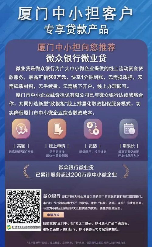 “微e担”是厦门市中小担携手微众银行,针对厦门地区的小微企业、个体工商户、小微企业主、“三农”、创业创新市场主体以及符合条件的战略性新兴产业提供高额高质效、低息低门槛的线上融资新通道。