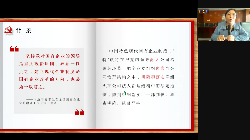 “未设支部委员会的党支部如何落实前置研究讨论的要求”“混合所有制党支部在“三重一大”决策中主要发挥什么作用?”虽然隔着电脑屏幕,却阻挡不住大家学习提问的热情,杜晓明老师耐心地一一解答。通过辅导讲座,既推动了集团党员干部进一步深入学习贯彻习近平新时代中国特色社会主义思想,又强化了政治意识,提升了落实党建责任的思想自觉、行动自觉。